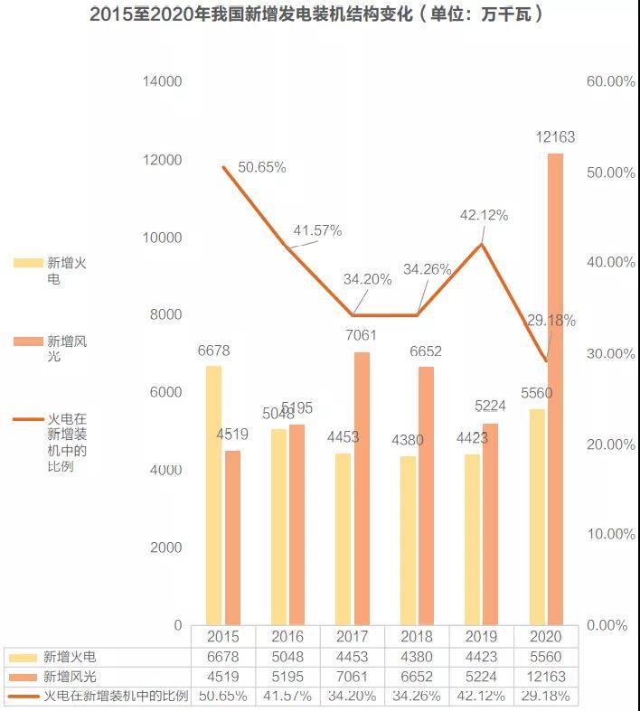 “十三五”期間,我國的風(fēng)電、光伏裝機容量進入飛速發(fā)展時期。與此同時,2015年之后的火電建設(shè)速度大大放緩。此消彼長之下,整個“十三五”期間每年的新增風(fēng)光裝機都大于火電裝機,而且火電在新增裝機中的比例也從2015年的50.65%下降至2020年的29.18%。