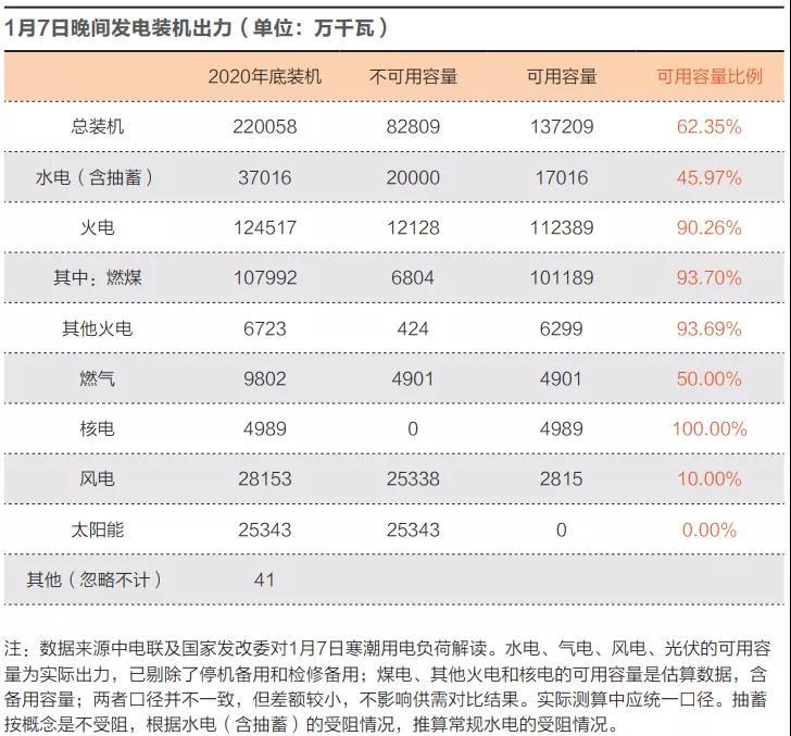 1月7日用電負荷高峰出現(xiàn)在晚上,2.5億千瓦的光伏裝機出力為0;加上全國范圍的小風(fēng)天氣,風(fēng)電出力也只有裝機容量的10%。這直接導(dǎo)致全國累計5.3億千瓦的風(fēng)電、光伏出力只有不到3000萬千瓦。當(dāng)日支撐用電負荷尖峰的主力是出力超過90%的火電和100%出力的核電。