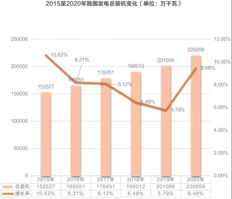 那么相對于需求端,電力供給端的情況怎么樣呢?國內(nèi)發(fā)電總裝機增速在2015至2019年呈現(xiàn)出不斷下滑趨勢,只有2020年有較快增長。根據(jù)《能源》雜志測算,2015年至2020年發(fā)電總裝機容量的年均增長率為7.61%。