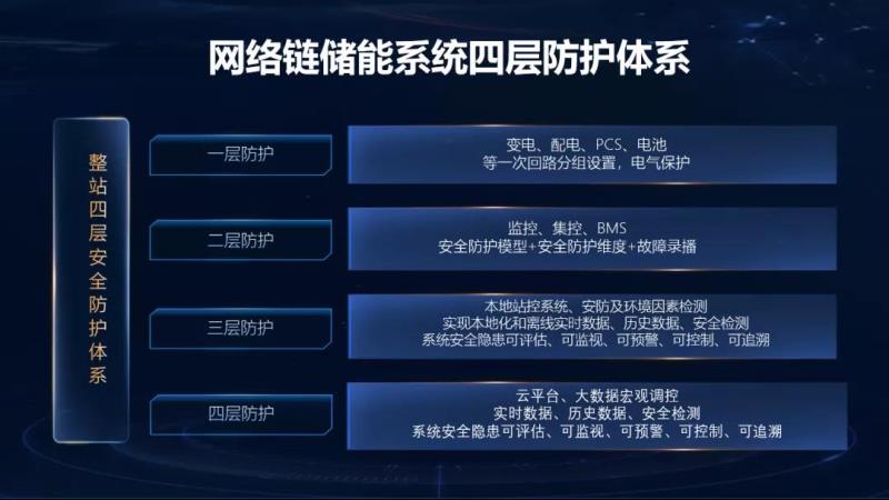 為了確保安全,領(lǐng)充公司還創(chuàng)新性的提出了四層安全防護(hù)體系: 網(wǎng)絡(luò)鏈儲能系統(tǒng)采用四層安全防護(hù)體系,通過對硬件層、控制層、站控層、平臺層的長期積累與分析,全方位保證儲能系統(tǒng)的安全,實(shí)現(xiàn)高級別安全防護(hù)。