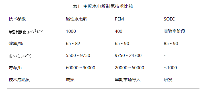風(fēng)電制氫的技術(shù)關(guān)鍵在于水電解制氫,水電解制氫技術(shù)主要有三種:堿性水電解制氫、純水質(zhì)子交換膜(PEM)水電解制氫、固態(tài)氧化物電解池(SOEC)電解水制氫。如表1所示,堿性水電解制氫技術(shù)和PEM水電解制氫技術(shù)現(xiàn)已有商業(yè)化運(yùn)行,前者較為成熟而后者由于成本較高暫處于早期商業(yè)化試驗(yàn)階段,SOEC雖然效率較高但還處于研發(fā)示范階段。