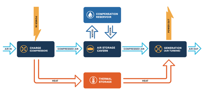 Hydrostor公司旨在建立大規(guī)模長時儲能系統(tǒng),壓縮空氣儲能(A-CAES)技術的工作原理是使用可再生能源發(fā)電設施的電力壓縮空氣,然后將其儲存在密封的地下鹽穴中,同時存儲在壓縮過程中產(chǎn)生的熱量。