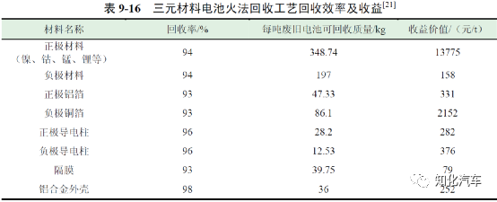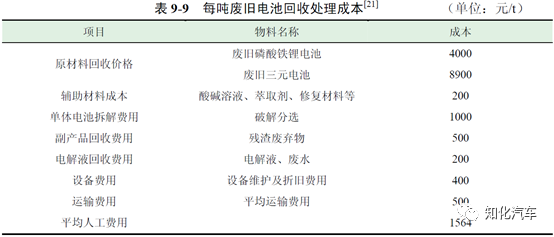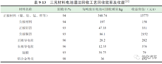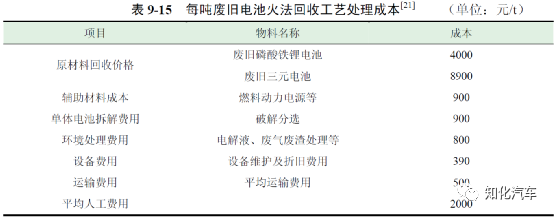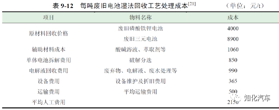 濕法回收工藝的成本主要來(lái)源于原材料回收成本、廢水廢棄物處理等方面,表9-12 為每噸廢舊電池濕法回收工藝處理成本。濕法回收工藝每處理一噸三元電池的平均成本為14815 元,每處理一噸磷酸鐵鋰電池的平均成本為9915 元。此外,采用濕法回收工藝對(duì)電池有價(jià)值材料回收的效率較高,因此收益情況也更明顯。