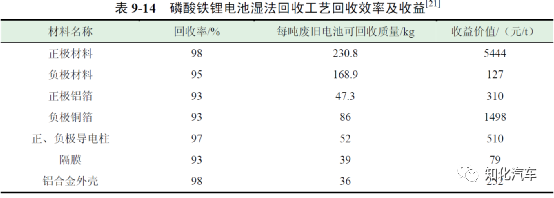 表9-13 和表9-14 為材料電池和磷酸鐵鋰電池濕法回收工藝回收效率及收益。通過(guò)以上數(shù)據(jù),得到采用濕法回收工藝回收每噸三元電池的平均收益為18073 元,回收每噸磷酸鐵鋰電池的平均收益為8220 元。因此,采用濕法回收工藝每回收一噸三元電池將盈利3258 元,每回收一噸磷酸鐵鋰電池將虧損1695 元。