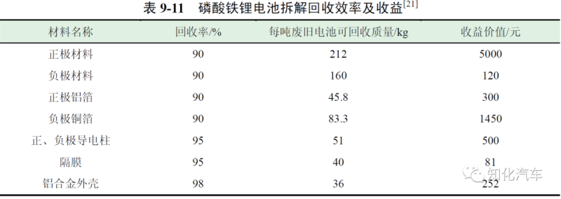 表9-10 為三元材料電池拆解回收效率及收益。每噸三元材料電池經(jīng)拆解后回收有價(jià)值金屬和材料的平均收益為16728 元。此外,經(jīng)過(guò)調(diào)研,對(duì)磷酸鐵鋰電池拆解收益情況也進(jìn)行了分析,磷酸鐵鋰電池拆解回收效率及收益如表9-11 所示。拆解每噸磷酸鐵鋰電池回收有價(jià)金屬和材料的收益約為7703 元。從前面分析數(shù)據(jù)可以看出,采用物理法回收每噸三元材料電池的拆解成本為13264 元,通過(guò)銷售拆解后得到的有價(jià)值材料獲得的收益為16728 元,因此,拆解回收每噸三元電池可盈利3464元;而每噸磷酸鐵鋰電池拆解成本為8364 元,收益為7703 元,因此拆解回收每噸磷酸鐵鋰電池將虧損661 元。