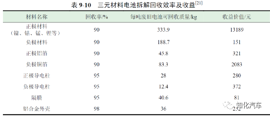 陶志軍和賈曉峰通過(guò)對(duì)北京賽德美動(dòng)力電池回收產(chǎn)業(yè)的調(diào)研,發(fā)現(xiàn)動(dòng)力電池回收過(guò)程中,成本主要集中在原材料回收、電池拆解預(yù)處理、廢水廢棄物處理、人工費(fèi)用等階段,表9-9 為每噸廢舊電池回收處理成本。其中,廢舊三元電池平均回收費(fèi)用為8900 元/t,經(jīng)過(guò)梯次利用之后且質(zhì)量較差的磷酸鐵鋰電池平均回收費(fèi)用為4000 元/t。從調(diào)研數(shù)據(jù)可以看出,回收及拆解每噸三元電池的平均成本為13264 元,回收及拆解每噸磷酸鐵鋰電池的平均成本為8364 元,動(dòng)力電池內(nèi)富含的大量的有價(jià)金屬是電池回收主要的收益來(lái)源,特別是近年來(lái)鎳、鈷、錳、鋰等金屬材料價(jià)格的上漲對(duì)動(dòng)力電池拆解回收領(lǐng)域起到了巨大的促進(jìn)作用。
