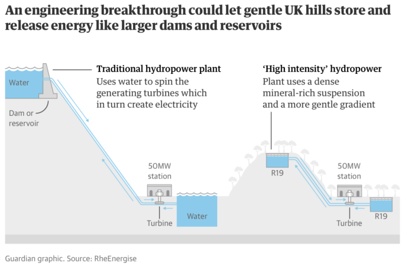 但是,這個(gè)“水電工程”實(shí)際上不是用的不是水,而是使用一種高密度的流體,其密度是水的兩倍半以上,因此可以儲(chǔ)存更多的電能。推動(dòng)這個(gè)項(xiàng)目的公司RheEnergise表示,在電力需求較低的時(shí)候,該項(xiàng)目將把高密度液體泵到200米的山上,存放在一個(gè)比奧運(yùn)會(huì)游泳池還大的地下儲(chǔ)水池里。然后,當(dāng)需要額外的電力時(shí),這些液體就會(huì)回流通過(guò)渦輪機(jī)發(fā)電,向電網(wǎng)供電。