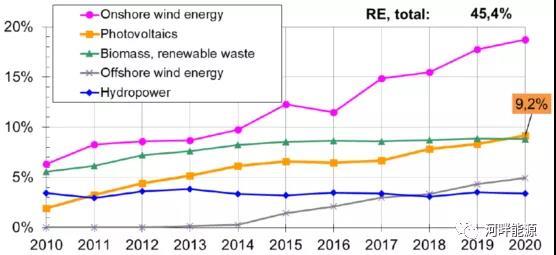 德國電能消費(fèi)中主要可再生能源發(fā)電量占比