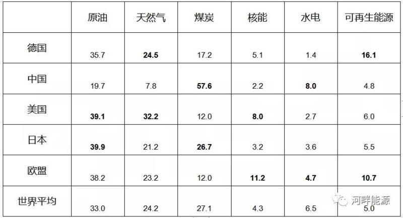 表3給出了2019年德國與世界主要經(jīng)濟(jì)體的能源消費(fèi)結(jié)構(gòu)的比較(數(shù)據(jù)來自《BP能源統(tǒng)計(jì)評論2021》)。