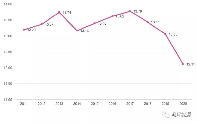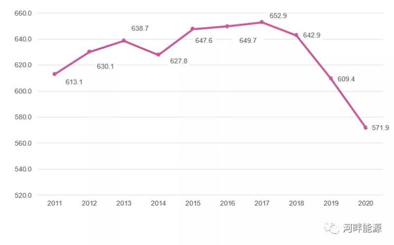 根據(jù)《BP能源統(tǒng)計(jì)評論2021》,2019、2020年德國一次能源消費(fèi)量分別相當(dāng)于中國的9.1%和8.3%。2011-2020年德國一次能源消費(fèi)量成“M”,2017年以來,呈現(xiàn)單調(diào)下降趨勢。近十年德國一次能源消費(fèi)量如下圖。