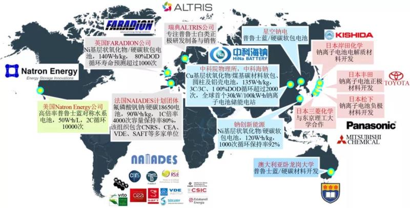 2010年以來,鈉離子電池受到國內(nèi)外學術界和產(chǎn)業(yè)界的廣泛關注。目前,鈉離子電池已逐步開始了從實驗室走向?qū)嵱没瘧玫碾A段,國內(nèi)外已有超過二十家企業(yè)正在進行鈉離子電池產(chǎn)業(yè)化的相關布局,并取得了重要進展,主要包括英國FARADION公司、法國NAIADES計劃團體、美國Natron Energy公司、日本岸田化學、豐田、松下、三菱化學,以及我國的北京中科海鈉科技有限公司、浙江鈉創(chuàng)新能源有限公司、遼寧星空鈉電電池有限公司等(圖4)。不同企業(yè)所采用電化學體系各有不同,其中正極材料體系主要包括層狀氧化物(如銅鐵錳和鎳鐵錳三元材料)、聚陰離子型化合物(如氟磷酸釩鈉)和普魯士藍類等,負極材料體系主要包括軟碳、硬碳以及軟硬復合無定形碳等。