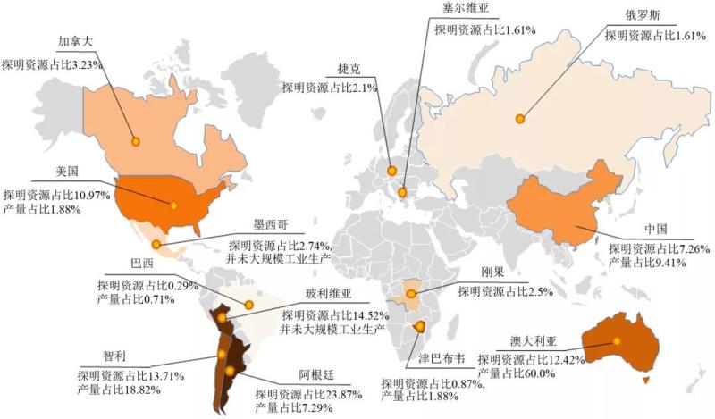 圖2 世界主要鋰資源國家的探明儲量和產(chǎn)量占比