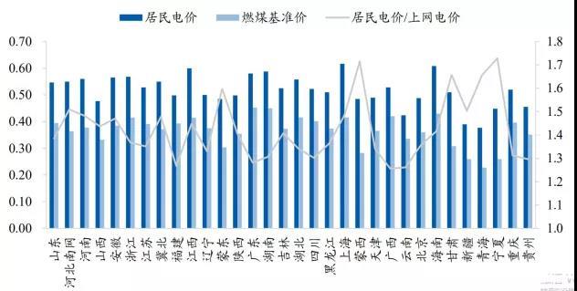 全國(guó)各地居民電價(jià)與燃煤基準(zhǔn)上網(wǎng)電價(jià)對(duì)比(元/kWh)
