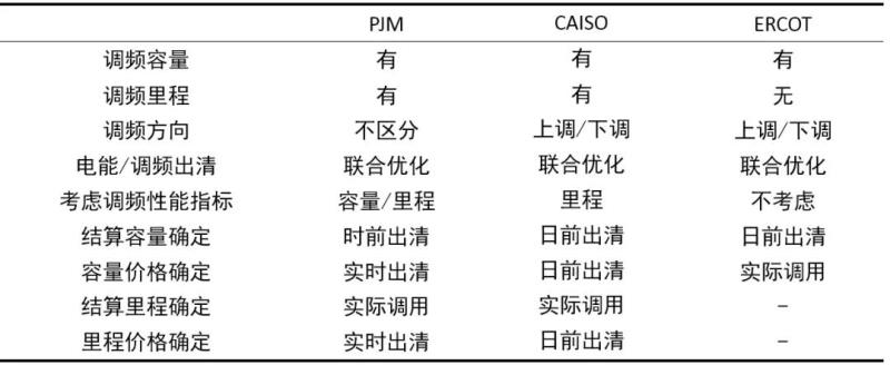 在交易和結(jié)算方式方面,PJM采用日前報價預(yù)出清、時前出清確定容量、實時出清確定價格和里程的方式,按照實時出清價格結(jié)算;CAISO日前確定出清價格和調(diào)頻容量,調(diào)頻里程按照實際調(diào)用里程結(jié)算;ERCOT采用日前確定出清價格、按照實際調(diào)用情況結(jié)算。