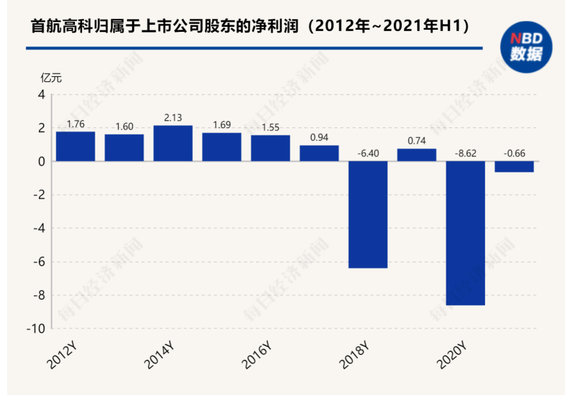 事實(shí)也是如此嗎?2018年~2020年,首航高科的凈利潤分別為-6.4億元、7419.88萬元、-8.62億元。在實(shí)現(xiàn)盈利的2019年,公司扣除非經(jīng)常性損益后的凈利潤也只有894.1萬元。今年上半年,首航高科的凈利潤虧損6595.95萬元。