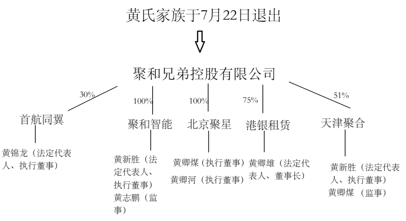 按照首航高科稱,賣方聚和兄弟控股有限公司(以下簡稱聚和兄弟)與公司及公司前十名股東不存在關(guān)系。而《每日經(jīng)濟(jì)新聞》記者注意到,就在一個(gè)多月前,聚和兄弟、北京聚星還是首航高科實(shí)際控制人黃文佳、黃文博所在黃氏家族控制的資產(chǎn)。此外,聚和兄弟旗下一眾子公司的管理層中,目前仍有諸多黃氏家族成員的身影浮現(xiàn)。