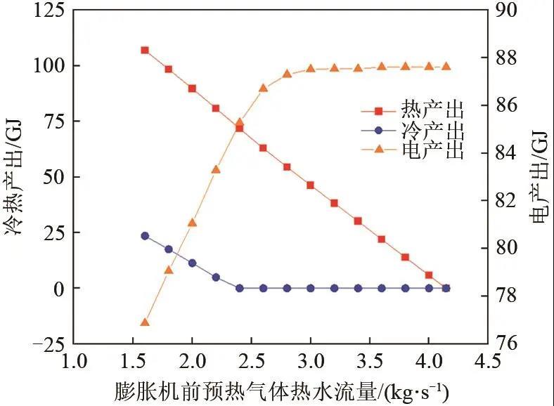 圖6為不同熱水流量下的冷熱電產(chǎn)出,所有工況點冷凍水流量均為2.5 kg/s。隨著熱水流量從1.6 kg/s升至4.144 kg/s,熱量產(chǎn)出和冷量產(chǎn)出均呈現(xiàn)下降趨勢,而電量產(chǎn)出呈現(xiàn)上升趨勢。熱量產(chǎn)出范圍為0~107 GJ,冷量產(chǎn)出范圍為0~23.5 GJ,電量產(chǎn)出范圍為76.87~87.61 GJ。熱量產(chǎn)出下降的原因是供給用戶的熱量是充能階段產(chǎn)熱減去釋能階段預(yù)熱量,因此預(yù)熱熱水流量越大,供給用戶的熱量呈現(xiàn)線性下降趨勢。冷量產(chǎn)出下降的原因是隨著熱水流量的增加,氣體預(yù)熱充分,通過膨脹機后溫度也隨時上升,當熱水流量為2.4 kg/s時,產(chǎn)出冷量為0,說明此時膨脹機后氣體溫度已經(jīng)超過環(huán)境溫度。電量產(chǎn)出上升的原因是隨著預(yù)熱熱水流量的上升,膨脹機前氣體預(yù)熱更充分,但熱水流量在升至3.0 kg/s后膨脹機電產(chǎn)出基本不再提升,這說明此時即使進一步提升熱水流量,空氣預(yù)熱后的溫度也不再上升,電量產(chǎn)出基本達到最大值。