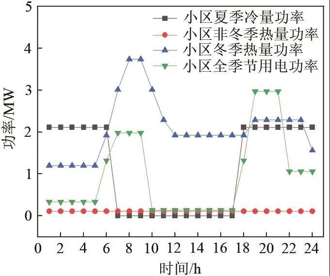 本文中冷熱電供應(yīng)對象為一個含660戶住戶的小區(qū)。假定每戶人口數(shù)為3人,住宅面積為100 m2。住宅電力負荷特性在夏季和非夏季的區(qū)別在于夏季有空調(diào)用電,夏季與非夏季電負荷變化趨勢類似,早晨與凌晨前晚上為用電高峰,而凌晨后至清晨以及10:00—17:00點的工作時段為用電低谷,為典型的工作日用電規(guī)律;住戶冷負荷只存在于夏季,由空調(diào)用電按照空調(diào)能效比計算得到;住宅熱負荷分冬季的供暖熱負荷和四季的日常用熱水的熱負荷,因此冬季熱負荷大于其他季節(jié)的熱負荷。