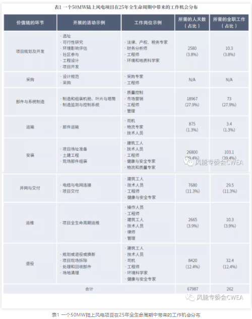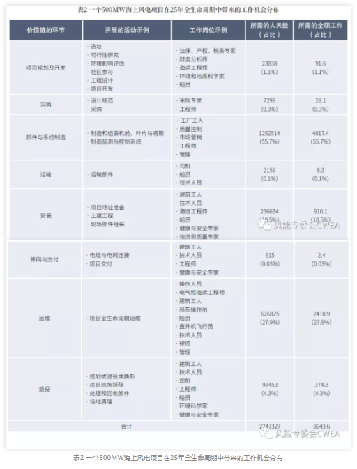 國際可再生能源署(IRENA)的研究顯示,一個典型的50MW陸上風(fēng)電項目在其25年全生命周期中,單位兆瓦裝機將帶來5.24個工作機會。一個典型的500MW海上風(fēng)電項目在其25年全生命周期中,單位兆瓦裝機會帶來17.29人年(person-years)的工作機會。