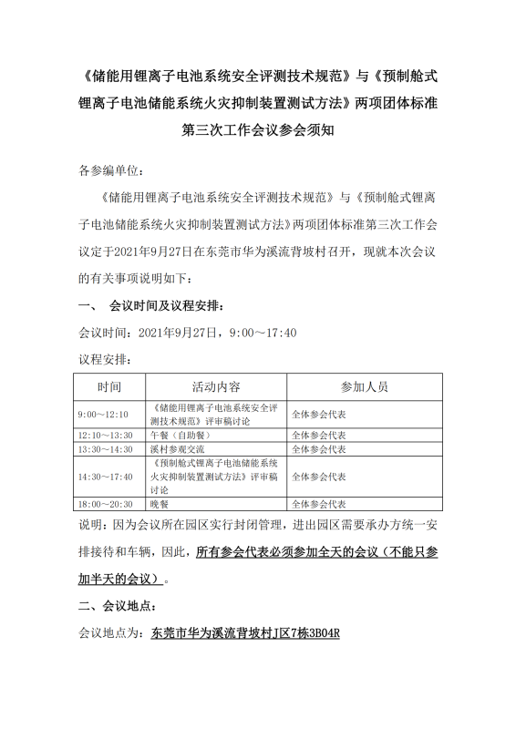 《儲能用鋰離子電池系統(tǒng)安全評測技術(shù)規(guī)范》與《預(yù)制艙式鋰離子電池儲能系統(tǒng)火災(zāi)抑制裝置測試方法》兩項團體標準第三次工作會議參會須知