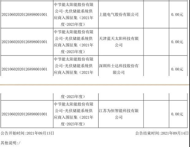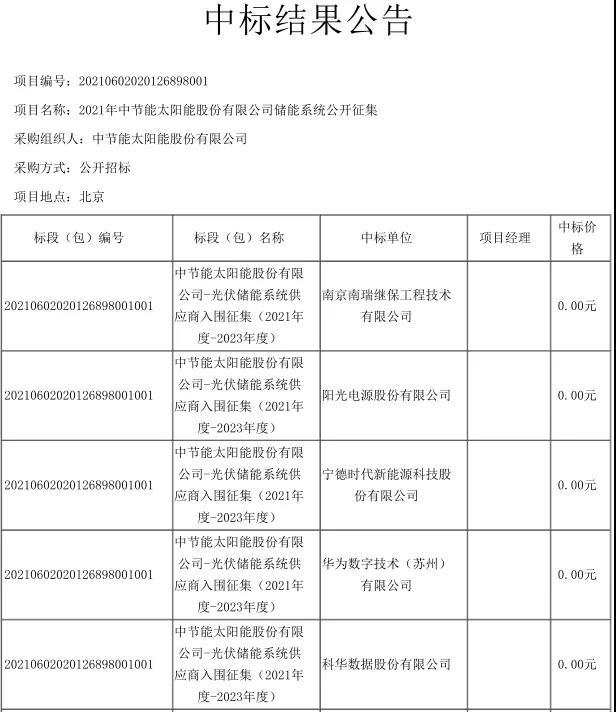 中節(jié)能太陽能股份有限公司2021年度-2023年度儲能系統(tǒng)供應(yīng)商中標結(jié)果公示,共有10家企業(yè)獲得中標!中標企業(yè)名單如下: