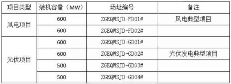 ZGEQWSJD-FD01#為風(fēng)電項(xiàng)目、裝機(jī)容量600MW;ZGEQWSJD-FD02#為風(fēng)電項(xiàng)目、裝機(jī)容量600MW;ZGEQWSJD-GD01#為光伏發(fā)電項(xiàng)目、裝機(jī)容量600MW;ZGEQWSJD-GD02#為光伏發(fā)電項(xiàng)目、裝機(jī)容量600MW;ZGEQWSJD-GD03#為光伏發(fā)電項(xiàng)目、裝機(jī)容量500MW;ZGEQWSJD-GD04#為光伏發(fā)電項(xiàng)目、裝機(jī)容量500MW;光伏發(fā)電項(xiàng)目采用農(nóng)光、牧光、林光互補(bǔ)等方式。