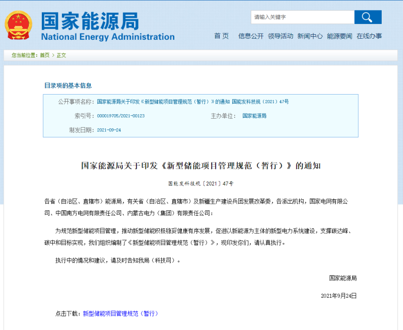 中國儲(chǔ)能網(wǎng)訊:2021年9月28日,國家能源局正式發(fā)布了《新型儲(chǔ)能項(xiàng)目管理規(guī)范(暫行)》(以下簡稱“《規(guī)范》”)?!兑?guī)范》在征求意見稿的基礎(chǔ)上,充分聽取社會(huì)各界的反饋意見并進(jìn)行了修改完善,對(duì)新型儲(chǔ)能項(xiàng)目的規(guī)劃引導(dǎo)、備案建設(shè)、并網(wǎng)運(yùn)行、監(jiān)測監(jiān)督等各個(gè)方面提出了明確具體的要求,制訂了一套科學(xué)、系統(tǒng)的管理規(guī)范,對(duì)于支撐新型儲(chǔ)能規(guī)?;l(fā)展、促進(jìn)以新能源為主體的新型電力系統(tǒng)建設(shè)、實(shí)現(xiàn)“碳達(dá)峰、碳中和”目標(biāo)具有重大意義。