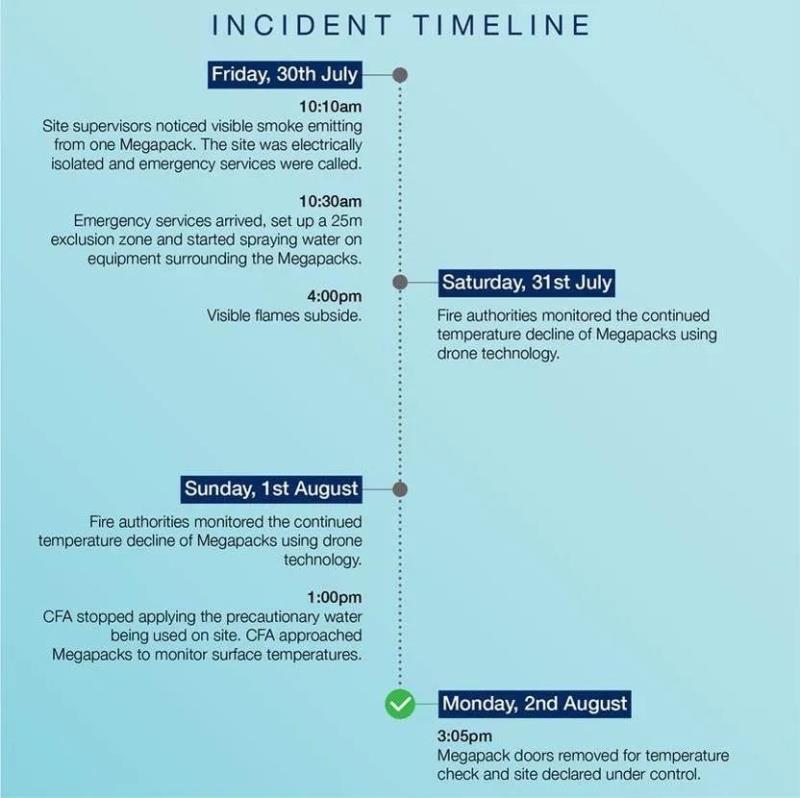 2021 年 7 月 30 日,Victorian Big Battery (VBB) 在調(diào)試期間發(fā)生火災(zāi),涉及兩個(gè) Megapack(集裝箱大小的電池單元)。一旦 CFA 控制住了局勢(shì),它就會(huì)將現(xiàn)場(chǎng)的控制權(quán)交給維多利亞能源安全局 (ESV)。ESV 隨后開始對(duì)事件進(jìn)行調(diào)查,以確定其根本原因以及應(yīng)采取哪些措施來防止類似事故再次發(fā)生。