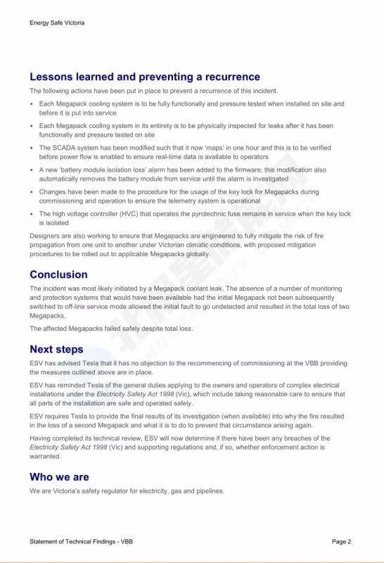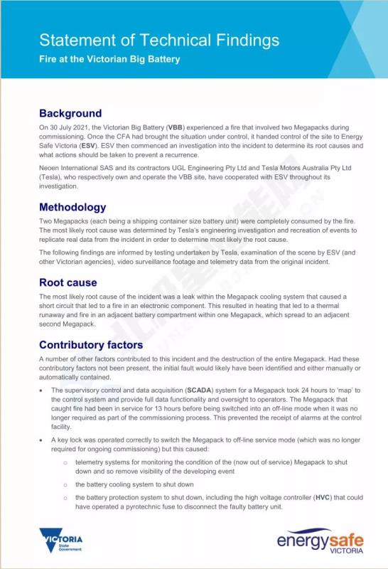 9月28日,維多利亞能源安全局正式發(fā)布了事故調(diào)查結(jié)果報(bào)告。報(bào)告顯示,綜合特斯拉進(jìn)行的詳細(xì)測(cè)試、維多利亞能源安全局和其他維多利亞州機(jī)構(gòu)對(duì)現(xiàn)場(chǎng)的檢查、以及視頻監(jiān)控錄像和原始事件的遙測(cè)數(shù)據(jù)等,最終得出結(jié)論:事件最可能的根本原因是 Megapack 集裝箱儲(chǔ)能系統(tǒng)冷卻系統(tǒng)內(nèi)泄漏導(dǎo)致短路,并引發(fā)電子元件起火。而局部過熱造成了熱失控,并引燃了同一個(gè)集裝箱內(nèi)與其相鄰的儲(chǔ)能電池,而后火勢(shì)又蔓延到相鄰的另一個(gè)集裝箱。