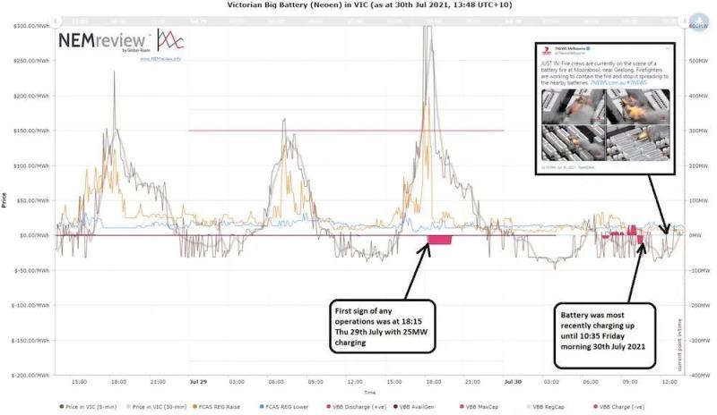 維多利亞儲(chǔ)能項(xiàng)目總裝機(jī)容量300MW/450MWh,此前Neoen與澳大利亞能源市場(chǎng)運(yùn)營商簽訂了一份為期 10 年的合同,主要是提供電力輔助服務(wù)以滿足新南威爾士州和維多利亞州之間的主要電力傳輸?shù)娜萘扛叻逍枨?,原?jì)劃于今年12月投運(yùn)。信息就在火災(zāi)發(fā)生之前的7月29和7月30日早上該項(xiàng)目還進(jìn)行了一些測(cè)試。