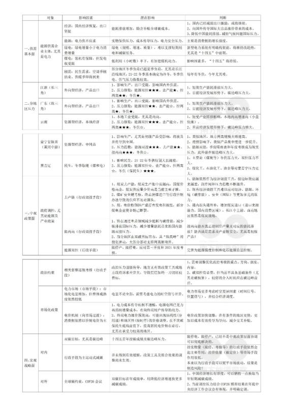綜上,區(qū)域差異方面,各地壓力指數(shù)不同,冬季保供(電、煤、氣)、去產(chǎn)能、控兩高、能源雙控及組合效果對(duì)各地影響差異較大。總體上,江浙、廣東、內(nèi)蒙等地壓力更大;能源雙控是既有政策,主要作用于消費(fèi)側(cè),總體影響較去產(chǎn)能低,東北三省、湘鄂贛渝等地的電、煤冬季保供壓力較大。