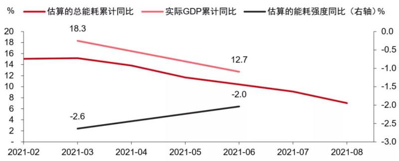 2021年全國(guó)能耗控制形勢(shì)不容樂觀,呈現(xiàn)總量上升、效率下降趨勢(shì)。據(jù)中信證券的測(cè)算,總能耗增速下降,但總量仍在增加,能耗強(qiáng)度下降率呈衰減趨勢(shì)。2021年前8個(gè)月,全國(guó)電力能耗、鋼鐵能耗、水泥能耗三項(xiàng)占全國(guó)能耗的60%以上,這三個(gè)部門是影響年內(nèi)能耗與碳排放控制目標(biāo)的關(guān)鍵。
