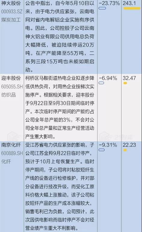 各行業(yè)的數(shù)十家上市公司紛紛公告停產(chǎn)、限產(chǎn)消息。據(jù)21世紀(jì)經(jīng)濟(jì)報道新能源課題組不完全統(tǒng)計,截至9月27日,已有23家上市公司發(fā)布了限電停產(chǎn)相關(guān)公告。最先宣布受到影響的,是廣西的陶瓷生產(chǎn)企業(yè)蒙娜麗莎(002918.SZ)。