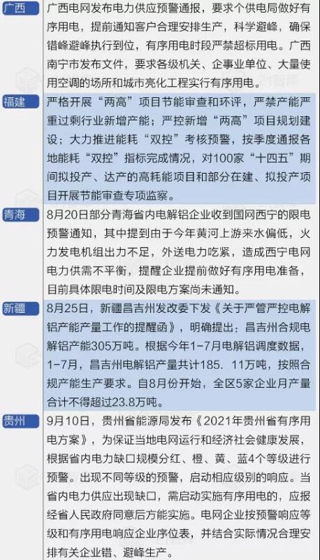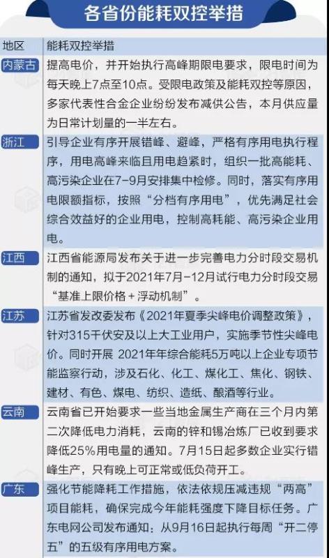 但自8月下旬以來,國家發(fā)改委點名多個省區(qū)能耗雙控工作未達(dá)標(biāo),并進(jìn)行預(yù)警。此后,能耗雙控工作緊張的地區(qū),陸續(xù)開始在三季度末實施限電限產(chǎn),試圖沖刺完成指標(biāo)。