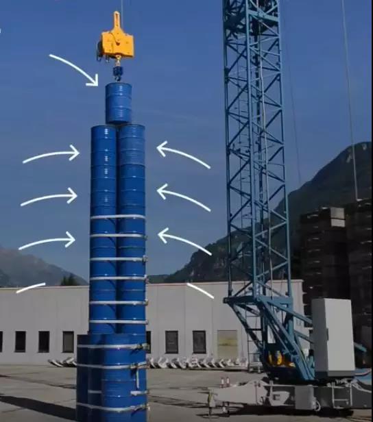 3.穩(wěn)定性控制難度太高。幾十米長、迎風飄擺的纜繩,需要做到讓 5000 塊磚,每一塊的位置誤差都小于幾毫米。否則,百米高塔就真的會像小孩子搭的積木一樣,說塌就塌。在知名媒體 Quartz 發(fā)布的一段 Energy Vault 原型機的視頻中,只有 20 米高的塔在被一道道鋼箍緊緊綁牢加固后,鋼纜的抖動幅度仍然明顯,遠不止幾毫米。而運行的30年年中又難免會遇到強風甚至地震,塔基能夠一直保持堅挺豎立嗎?