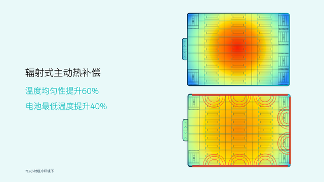 其三,輻射式主動(dòng)熱補(bǔ)償。如果車輛長時(shí)間處在低溫環(huán)境下,電池包會(huì)主動(dòng)開啟輻射加熱系統(tǒng),均勻加熱電芯,確保電池包快速到底最優(yōu)的工作溫度,同時(shí)兼顧能耗。根據(jù)測試,12小時(shí)極冷環(huán)境下,電池的最低溫度能夠提升40%,溫度均勻性可以提升60%。