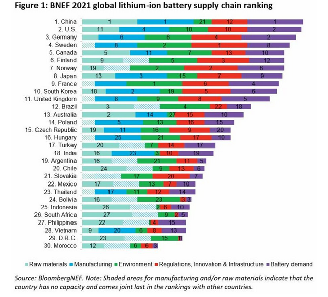 北歐國家廉價(jià)的低碳電力使其成為吸引投資的樞紐:在瑞典,電池生產(chǎn)廠商N(yùn)orthvolt公司已經(jīng)具備了年產(chǎn)60GWh電池的能力,并且正在芬蘭建設(shè)一座大型硫酸鎳和鈷精煉廠,這兩個(gè)國家在2021年的電池供應(yīng)鏈中排名第四和第六。