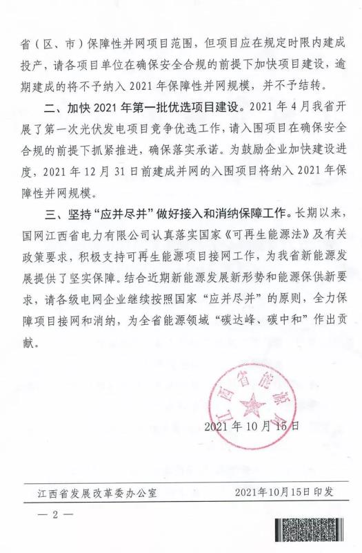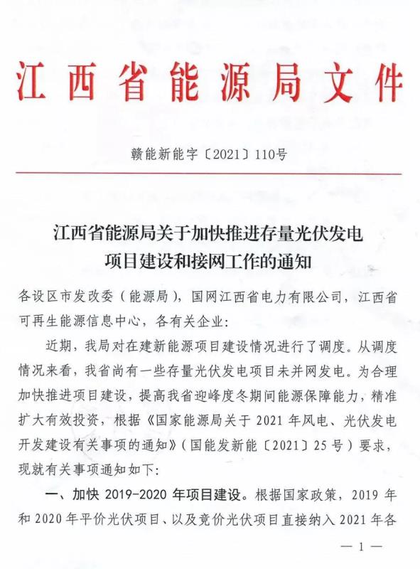10月15日,江西省能源局下發(fā)《關(guān)于加快推進存量光伏發(fā)電項目建設(shè)和接網(wǎng)工作的通知》,明確要求存量光伏項目加快建成并網(wǎng),新增項目年底建成并網(wǎng)的可直接納入2021年保障性并網(wǎng)規(guī)模。