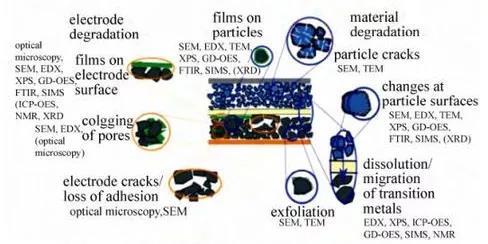 圖14 常見電池內(nèi)部失效點(diǎn)的表征分析技術(shù)
