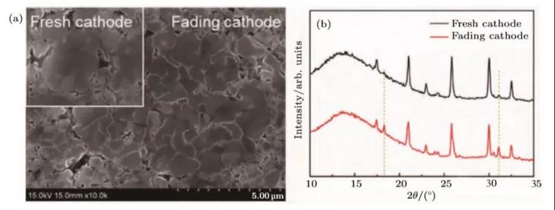 所謂電池有損檢測是指通過電池拆解、極片觀察及材料測試分析來確定正負(fù)極片、活性材料以及隔膜等因素在電池失效中的作用。其中材料的測試分析則以物化性能和電化學(xué)性能測試為主。例如對上述LiFePO4/C失效電池極片進(jìn)行掃描電子顯微鏡(SEM)形貌測試結(jié)果顯示正極材料有明顯的結(jié)構(gòu)破壞,X射線衍射(XRD)結(jié)構(gòu)譜圖中18.5?和31?峰強(qiáng)的增加揭示了Fex(POy)相的增加,即正極材料存在相變現(xiàn)象(如圖8所示)。對極片表面進(jìn)行X射線光電子能譜(XPS)分析,以及對極片進(jìn)行半電池測試則能夠定性和定量分析極片表面SEI和容量損失。最后總結(jié)得出定性或定量的失效原因,并提供分析報(bào)告。鋰電池失效機(jī)理研究是通過大量基礎(chǔ)科研,以及構(gòu)建合理模型和驗(yàn)證實(shí)驗(yàn), 準(zhǔn)確模擬分析電池內(nèi)部復(fù)雜的物理化學(xué)反應(yīng)過程, 找出電池失效的本質(zhì)原因,構(gòu)建失效原因數(shù)據(jù)庫。電池機(jī)理分析可能會從不同角度去開展,包括設(shè)計(jì)材料角度和設(shè)計(jì)失效角度。
