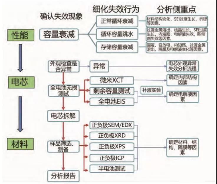 電池企業(yè)及材料企業(yè)各自開展鋰離子電池失效分析的研究,但多偏重于電池制造工藝和材料的研發(fā)制備,以提高電池性能、降低電池成本為直接目標(biāo),多采用大量正向驗(yàn)證實(shí)驗(yàn),并累積了豐富的經(jīng)驗(yàn)和方法,但在逆向解析和精準(zhǔn)分析方面存在經(jīng)驗(yàn)和技術(shù)仍有欠缺的問題。出于效率和效益的角度考慮,相關(guān)企業(yè)更希望在現(xiàn)有常規(guī)測試技術(shù)的基礎(chǔ)上發(fā)展具有高效性、準(zhǔn)確性和普適性的失效分析方法,這對設(shè)計(jì)測試分析流程提出了更高的要求。