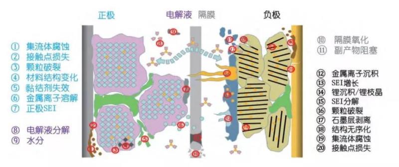 失效是失效原因的最終表現(xiàn),也是失效原因在一定時(shí)間內(nèi)疊加失效現(xiàn)象的結(jié)果。失效分析的重要任務(wù)之一是對失效原因進(jìn)行準(zhǔn)確判定。常見的鋰電池失效原因有活性物質(zhì)的結(jié)構(gòu)變化、活性物質(zhì)相變、活性顆粒出現(xiàn)裂紋或破碎、過渡金屬溶出、體積膨脹、固體電解質(zhì)界面(SEI)過度生長、SEI分解、鋰枝晶生長、電解液分解 或失效、電解液不足、電解液添加劑的失配、集流體腐蝕或溶解、導(dǎo)電劑失效、黏結(jié)劑失效、隔膜老化失效、隔膜孔隙阻塞、極片出現(xiàn)偏析、材料團(tuán)聚、電芯設(shè)計(jì)異常、電芯分容老化過程異常等。圖5展示的是鋰電池內(nèi)部失效情況。從鋰電池失效原因研究內(nèi)容可將其分為外因和內(nèi)因。