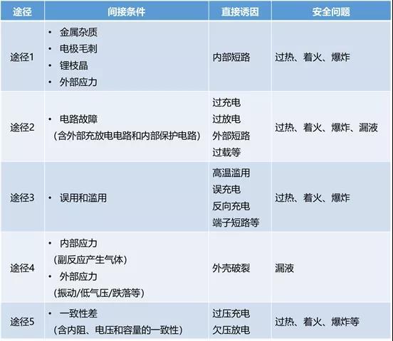 途徑5主要與一致性有關(guān)。在由多節(jié)電池(電芯)通過串聯(lián)、并聯(lián)以及串并混聯(lián)構(gòu)成的電池組中,電池之間的內(nèi)阻、開路電壓、容量的一致性會造成對電池組內(nèi)部的某一電池或電池并聯(lián)塊的過壓充電、欠壓放電等,從而引起安全問題。