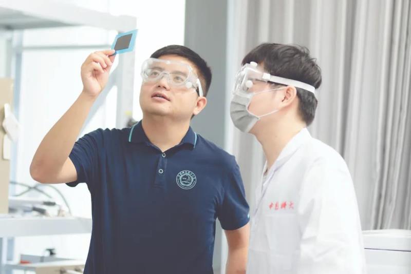梁海偉(左)與團(tuán)隊成員測試燃料電池膜電極。中國科學(xué)技術(shù)大學(xué)供圖