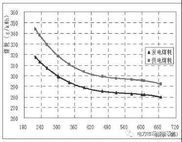 煤電機(jī)組進(jìn)行深調(diào)改造,會(huì)帶來安全性、環(huán)保性、經(jīng)濟(jì)性的問題。火電機(jī)組在深調(diào)模式下煤耗增長5%,靈活性改造每獲得10萬千瓦調(diào)峰能力年滾動(dòng)成本約150萬元[3]。下圖為660MW機(jī)組在不同負(fù)荷水平下的發(fā)電、供電煤耗曲線[4],在深調(diào)階段(出力從50%降到30%),煤耗增加51克。