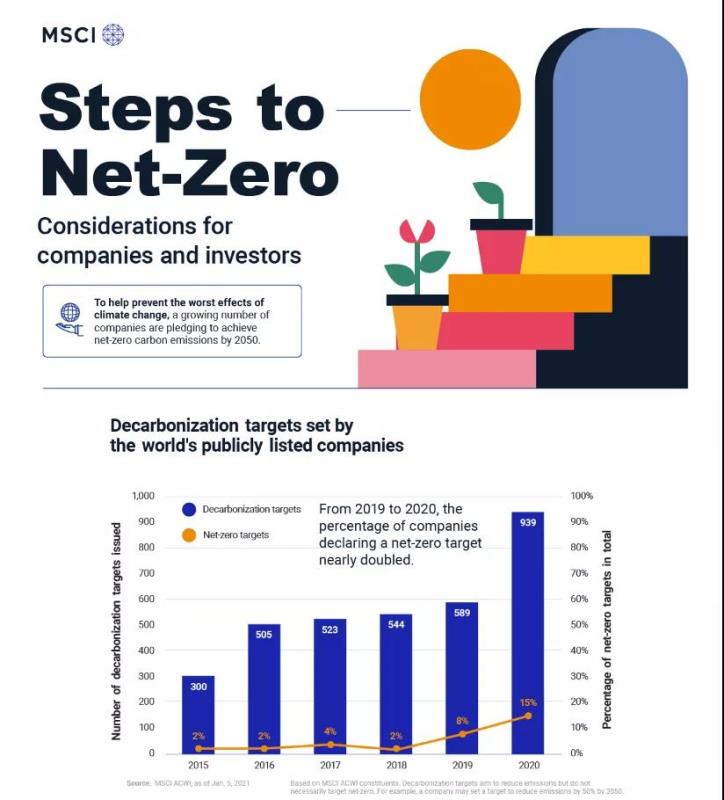 據(jù)visualcapitalist.com網(wǎng)站報道,為了幫助防止氣候變化的最壞影響,全球越來越多的公司承諾到2050年實現(xiàn)凈零排放,從2019年到2020年全球宣布凈零目標(biāo)的公司比例幾乎翻了一番。具體而言,企業(yè)和投資者可以采取四大步驟實現(xiàn)目標(biāo)。
