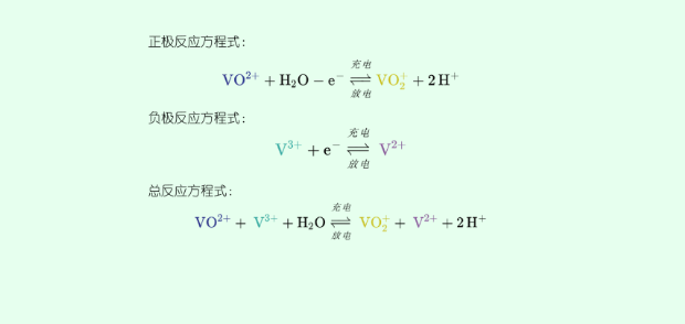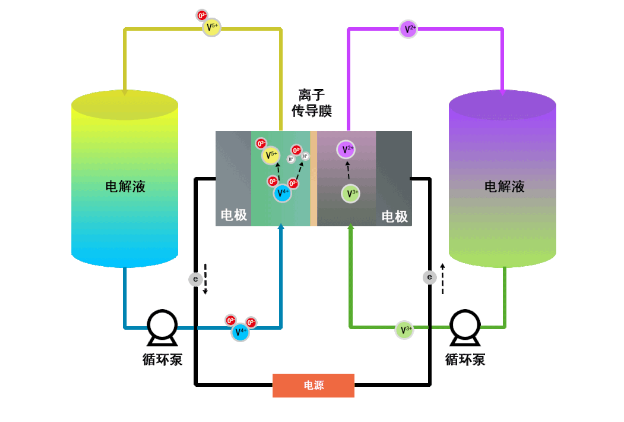 在全釩液流電池中,不同價(jià)態(tài)的釩離子儲(chǔ)存在正負(fù)極儲(chǔ)罐的電解液中,利用循環(huán)泵讓電解液在對(duì)應(yīng)的電極與儲(chǔ)液罐中循環(huán)流動(dòng),并使用離子傳導(dǎo)膜將正負(fù)極隔開,利用正極發(fā)生的四價(jià)和五價(jià)釩離子的氧化還原反應(yīng)和負(fù)極發(fā)生的二價(jià)與三價(jià)釩離子的氧化還原反應(yīng)實(shí)現(xiàn)化學(xué)能和電能的相互轉(zhuǎn)換。