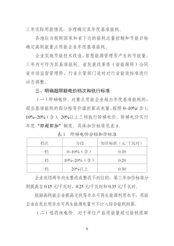 此外,明確了超限額電價檔次和執(zhí)行標準:(一)階梯電價。重點用能企業(yè)超出年度基準能耗的,超出基準能耗的部分按等價值折算成電量,按照0~10%(含)、10%~20%(含)、20%以上三檔執(zhí)行階梯電價。階梯電價實行年度“即超即加”制度。對于企業(yè)連續(xù)兩年內未整改或整改不到位的,加大階梯電價加價幅度。