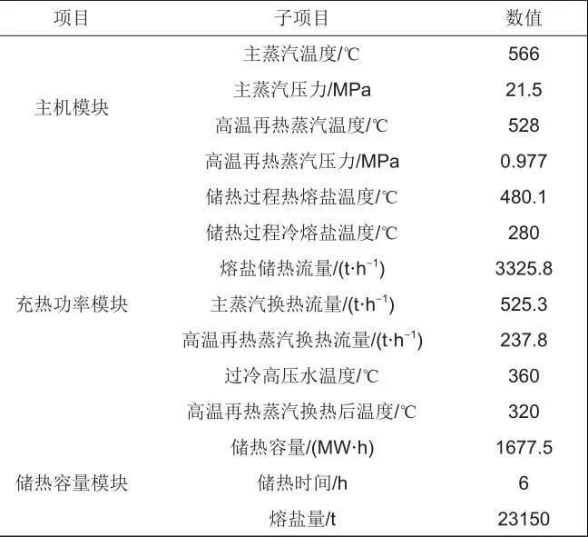 結(jié)合工程實際和前述理論分析,百兆瓦級熔鹽儲能技術(shù)選定技術(shù)參數(shù)見表1。儲熱容量指熔鹽儲能系統(tǒng)設(shè)計儲存熱量,由充熱功率和充熱時長決定。其中,充熱時長取火電機組供熱季常見的調(diào)峰時長6 h。充熱功率為主機模塊中鍋爐熱功率與汽輪機所需蒸汽熱功率差值,則本例充熱功率為279.6 MW。故熔鹽儲能系統(tǒng)設(shè)計儲熱量為1677.5 MW·h。