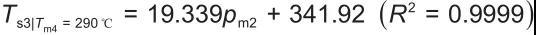 計算選取的主蒸汽壓力范圍是13.5 MPa≤p≤21.5 MPa,該壓力范圍對應(yīng)的蒸汽飽和溫度范圍是333.8~371.8 ℃,可保證主蒸汽冷凝放出大量熱被冷熔鹽(280 ℃)吸收。由圖3可知,隨著主蒸汽壓力(pm2)的增大,熔鹽儲熱過程熱熔鹽溫度(Ts3)也逐漸提高,且兩者近似呈線型關(guān)系。以過冷高壓水溫度(Tm4)290 ℃為例,兩者關(guān)系為